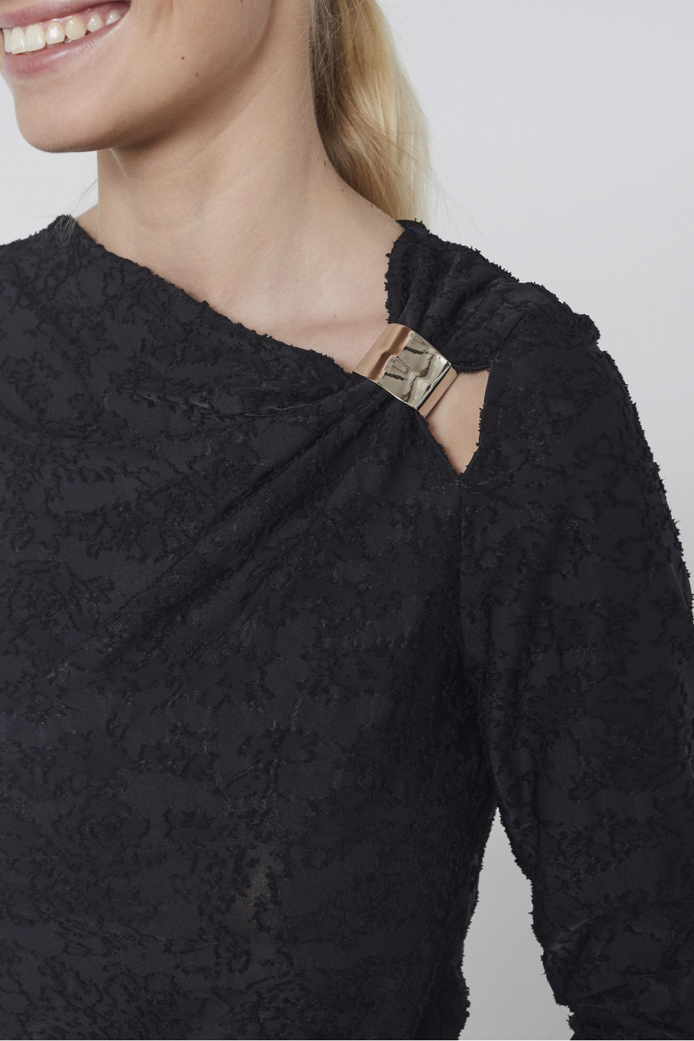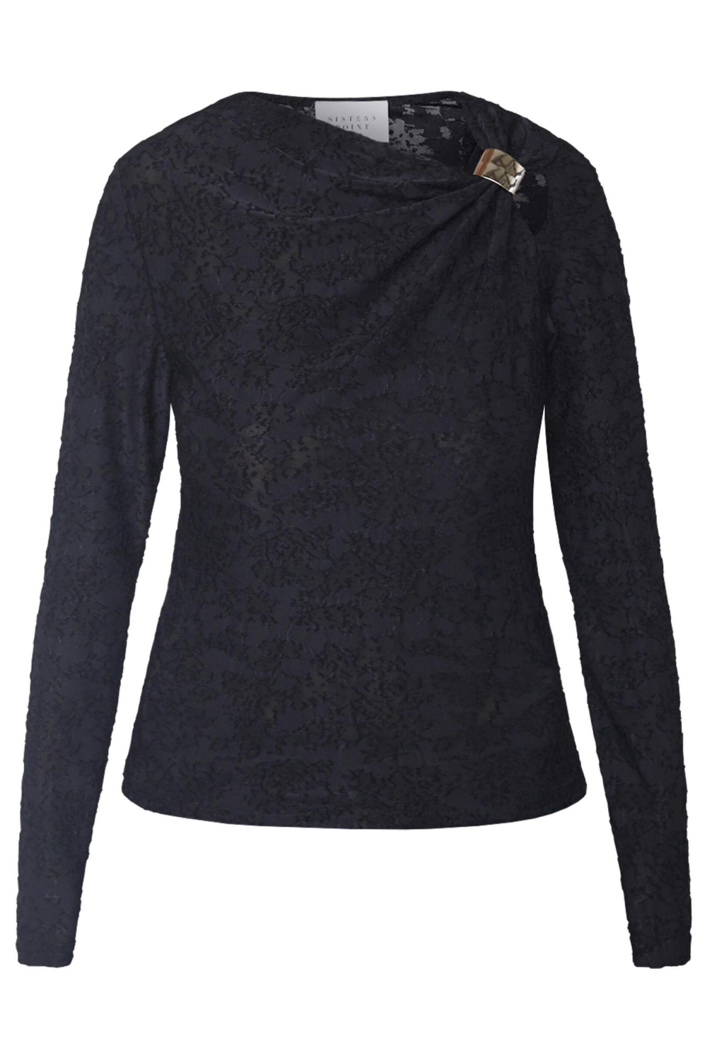 Het SisterS point T-shirt voor dames is een stijlvolle keuze voor je wintergarderobe. Gemaakt van 90% polyester en 10% elastan, biedt het een comfortabele regular fit die je de hele dag mooi op zijn plek houdt. De zwarte stof heeft een subtiel gestructureerd patroon dat een elegante uitstraling geeft, terwijl de details, zoals de ronde hals en de opvallende metalen sluiting op de schouder, zorgen voor een unieke look.