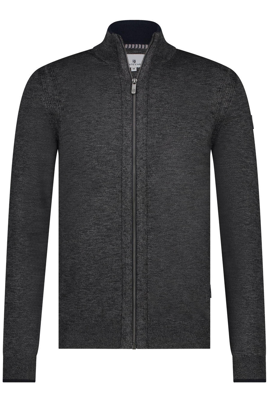 Fijngebreid vest van State of Art met lange mouwen. Dit model heeft een hoge kraag en sluit met een rits. Het vest is afgewerkt met een ribgebreide boord en is gemeleerd.
