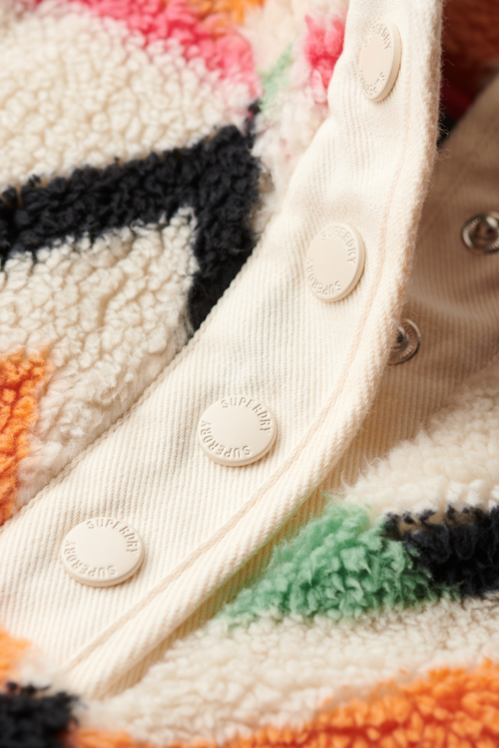 Deze opvallende damestrui van Superdry is een kleurrijke toevoeging aan je wintergarderobe. Gemaakt van 100% gerecycled polyester, draagt de trui bij aan een duurzame kledingstijl. De grafische patronen in heldere kleuren zoals roze, oranje en groen geven een speelse uitstraling die bij elke casual look past. De regular fit en lange mouwen zorgen voor een comfortabele pasvorm tijdens koude dagen. Met de handige drukknoopsluiting bij de high neck blijf je heerlijk warm, ongeacht het weer.