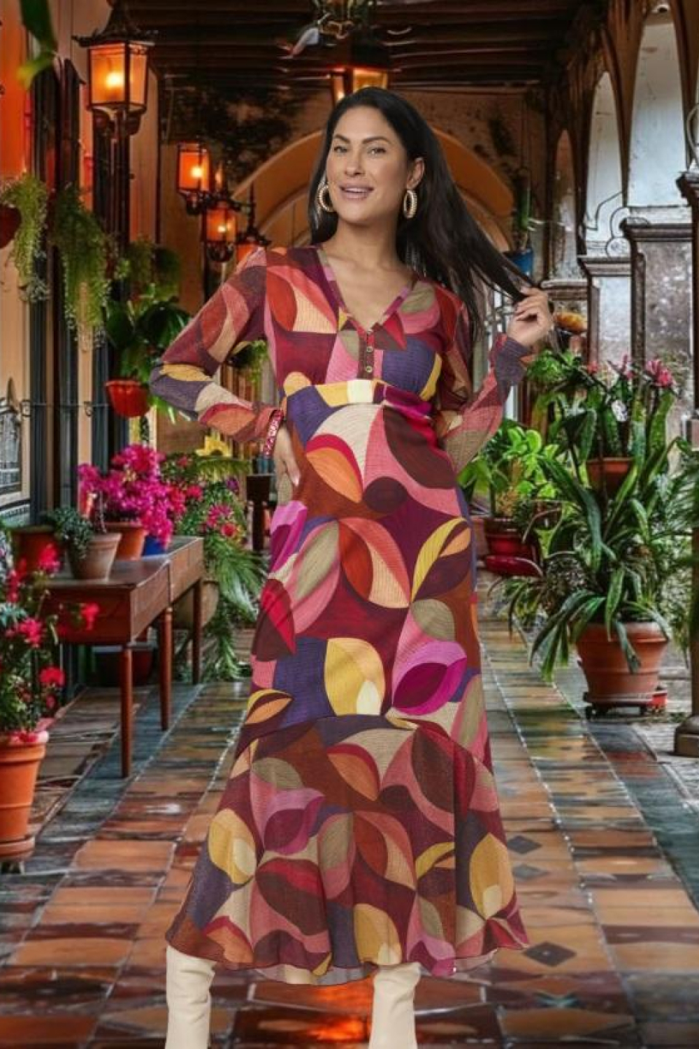 Deze kleurrijke lange jurk van Tessa Koops is een opvallende toevoeging aan je garderobe. Met zijn levendige patroon in warme tinten valt deze jurk direct op. De V-hals en knoopsluiting aan de voorkant zorgen voor een speelse en vrouwelijke uitstraling. Dankzij de lange mouwen is de jurk ideaal voor elk seizoen. De regular pasvorm biedt comfortabel dragen, terwijl je toch stijlvol blijft voor diverse gelegenheden.