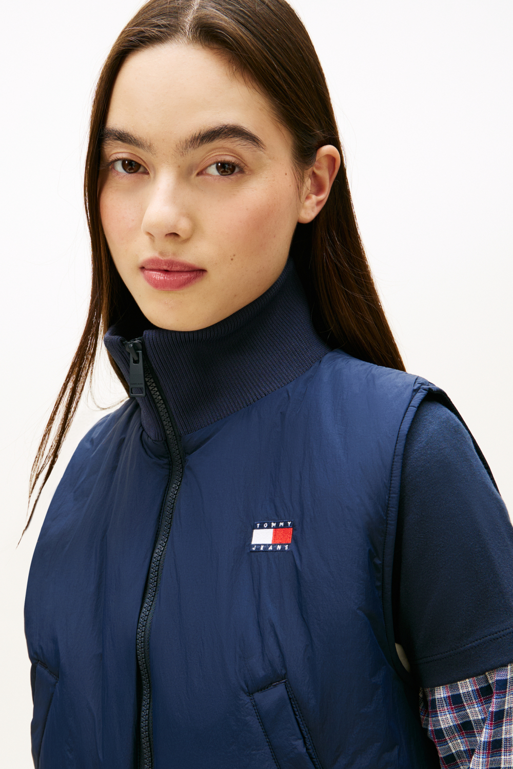 Deze casual damesjas van Tommy Jeans, uitgevoerd in de kleur C1G DARK NIGHT NAVY, is een stijlvolle optie voor de winter. De jas heeft een regular fit en is gemaakt van 100% polyamide, wat zorgt voor een licht en comfortabel gevoel. De mouwloze jas met een high neck design biedt een moderne uitstraling en de handige ritsluiting maakt hem praktisch voor dagelijks gebruik. De gewatteerde polyester voering biedt extra warmte, ideaal voor koude dagen. Met zijn specifieke uiterlijkse kenmerken, zoals de steekzakken en het opvallende logo op de borst, is deze jas een perfecte aanvulling voor je casual outfits. Of je nu een wandeling maakt in de stad of een dagje uit gaat, deze kortere jas combineert mooi met zowel jeans als rokjes. De duurzame materialen en het veelzijdige ontwerp maken het een praktische keuze voor verschillende informele gelegenheden. Voeg deze Tommy Jeans jas toe aan je garderobe voor een warme en stijlvolle winter. Meer informatie: De totale lengte is 46 cm bij maat S.
