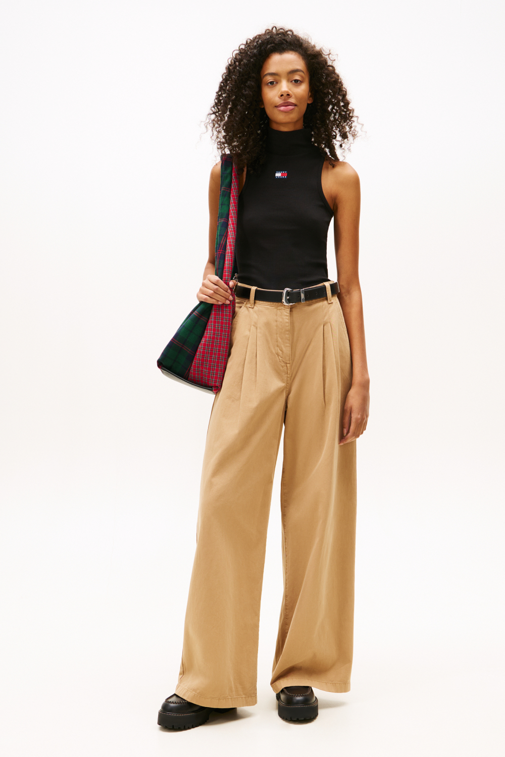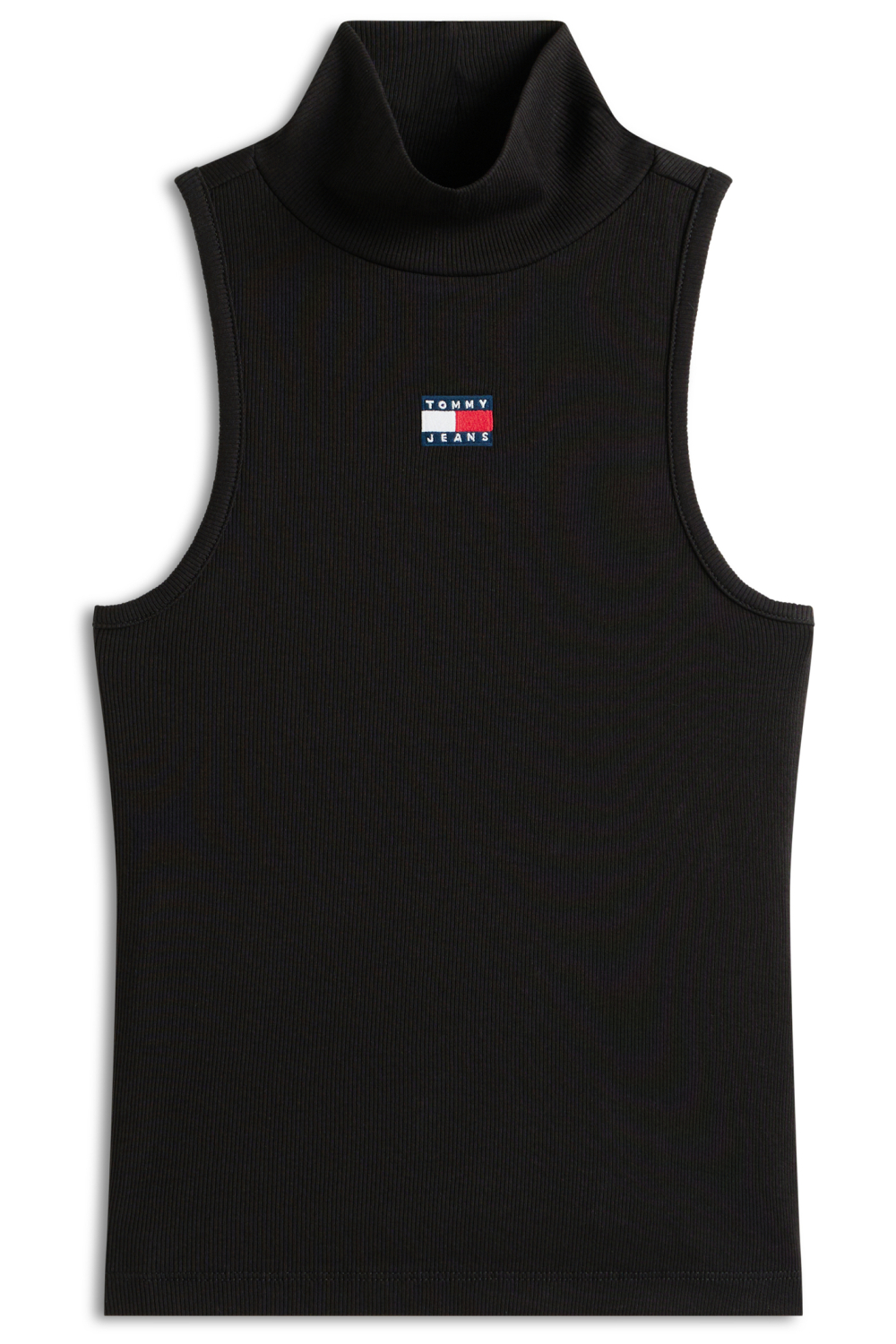 Dit zwarte high neck topje van Tommy Jeans is een veelzijdige aanvulling op jouw wintergarderobe. Het topje heeft een slanke pasvorm en is gemaakt van een comfortabele katoenmix met 5% elastaan, wat zorgt voor een fijne stretch. De ribstructuur geeft een subtiel detail aan de casual stijl, terwijl de high neck een verfijnde look creëert. Het mouwloze ontwerp maakt het ideaal om te dragen onder een jas of vest, maar ook perfect voor een avondje uit. De normale lengte en het ingetogen ontwerp maken het makkelijk te combineren met verschillende outfits. Draag deze tops met een wijde pantalon en stoere laarzen voor een modern silhouet. Het subtiele Tommy Jeans logo op de borst voegt een speelse merktoets toe. Of je nu een dagje op kantoor hebt of ontspannen door de stad wilt wandelen, dit topje past in elke situatie en elke stijl.