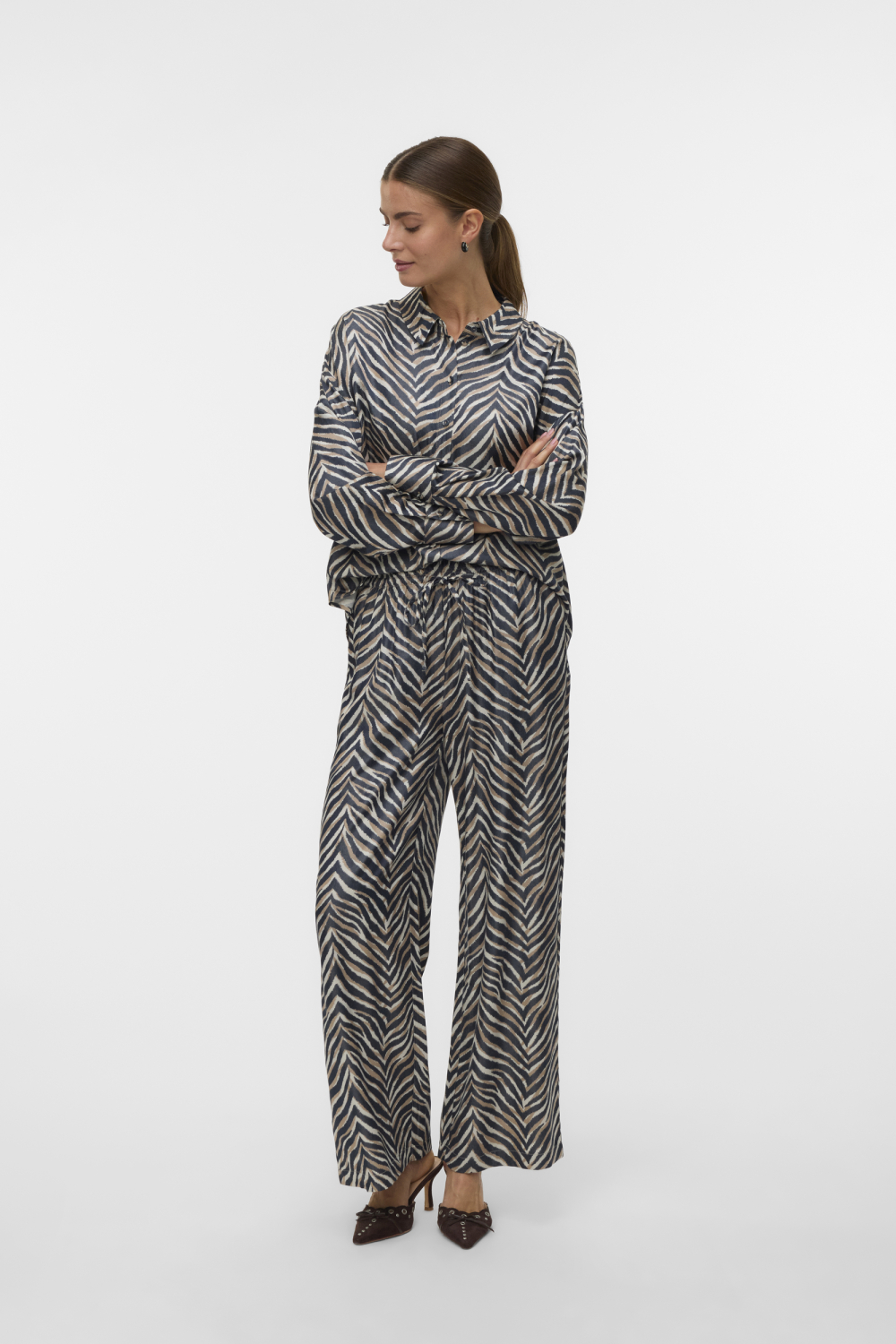 Deze grafische broek van Vero Moda voor dames, met de levendige Black/Sonya print, biedt een stijlvolle en veelzijdige toevoeging aan je wintergarderobe. Het rechte model met een elastische boord zorgt ervoor dat je de broek comfortabel en gemakkelijk kunt dragen. Gemaakt van 69% viscose en 31% polyester, biedt de stof een zachte en soepele pasvorm die ideaal is voor een casual dagje uit. De steekzakken geven een subtiele praktische touch, terwijl de grafische print je outfit een opvallende uitstraling geeft. De winterse combinatie van donkere tinten maakt deze broek een perfecte match voor zowel informele brunches als relaxte avondjes met vrienden. Dankzij de normale lengte kun je deze broek gemakkelijk combineren met zowel gympen als nette schoenen. Deze broek laat zich ook uitstekend combineren met een effen top of blouse voor een gebalanceerde look. Of je nu een drukke dag voor de boeg hebt of wilt ontspannen, met deze broek van Vero Moda zie je er altijd goed uit.