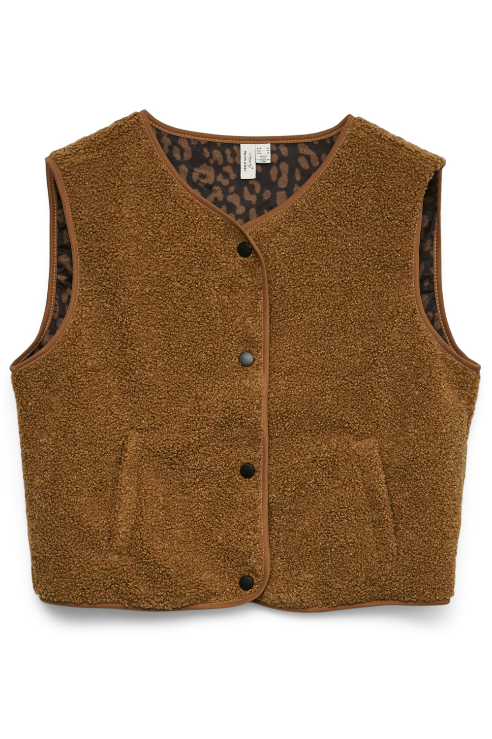 Dit elegante teddy gilet van Vero Moda is een stijlvolle toevoeging aan je wintergarderobe. Met zijn warme bruine kleur en comfortabele 100% polyester samenstelling biedt dit mouwloze vest precies de juiste dosis warmte op koude dagen. De ronde halslijn en de handige drukknoopsluiting zorgen voor een eenvoudige, maar modieuze uitstraling die perfect is voor dagelijks gebruik. De steekzakken aan de voorkant bieden zowel functionaliteit als een casual touch, wat het gilet ideaal maakt voor diverse gelegenheden.