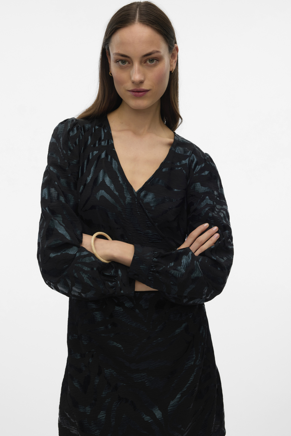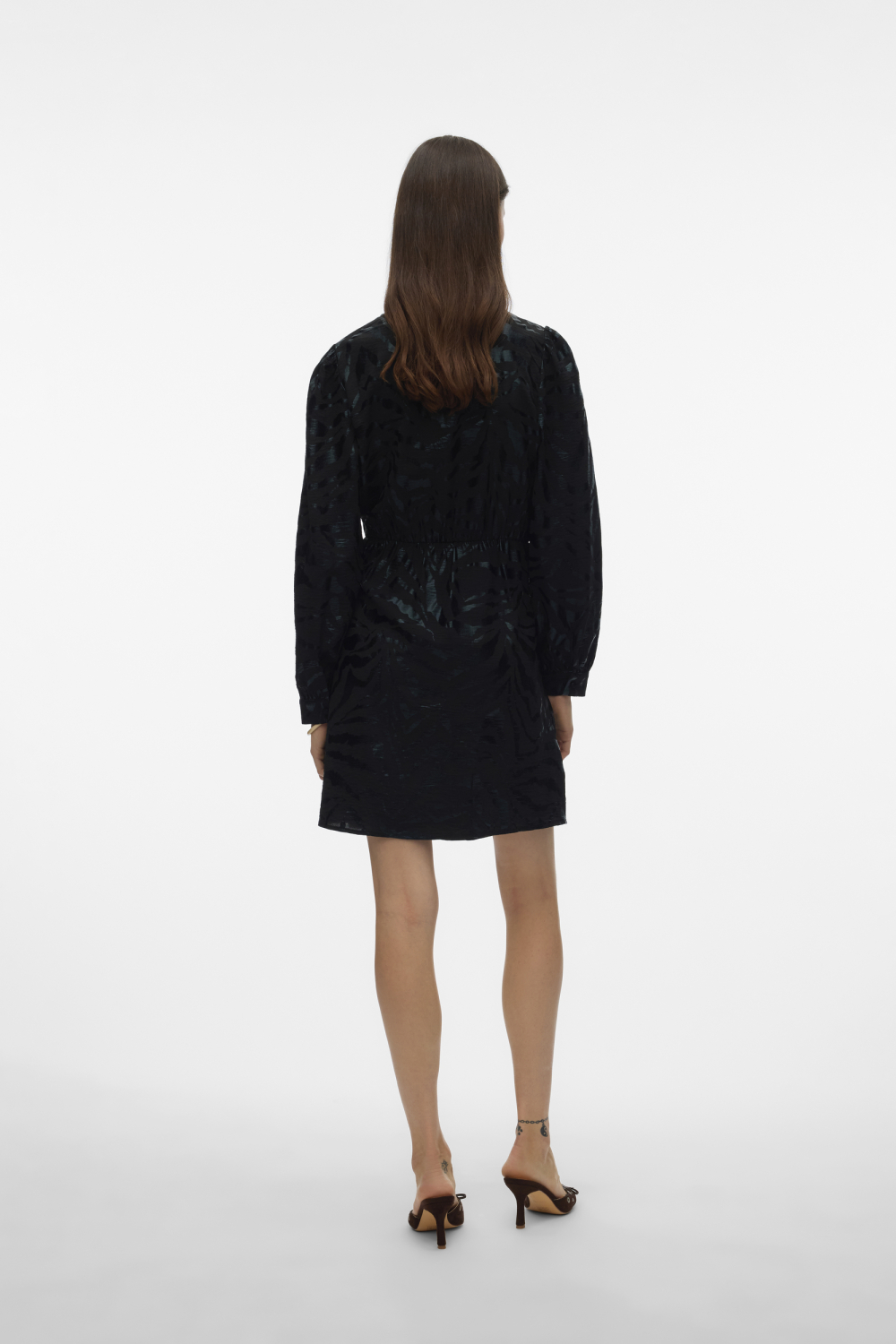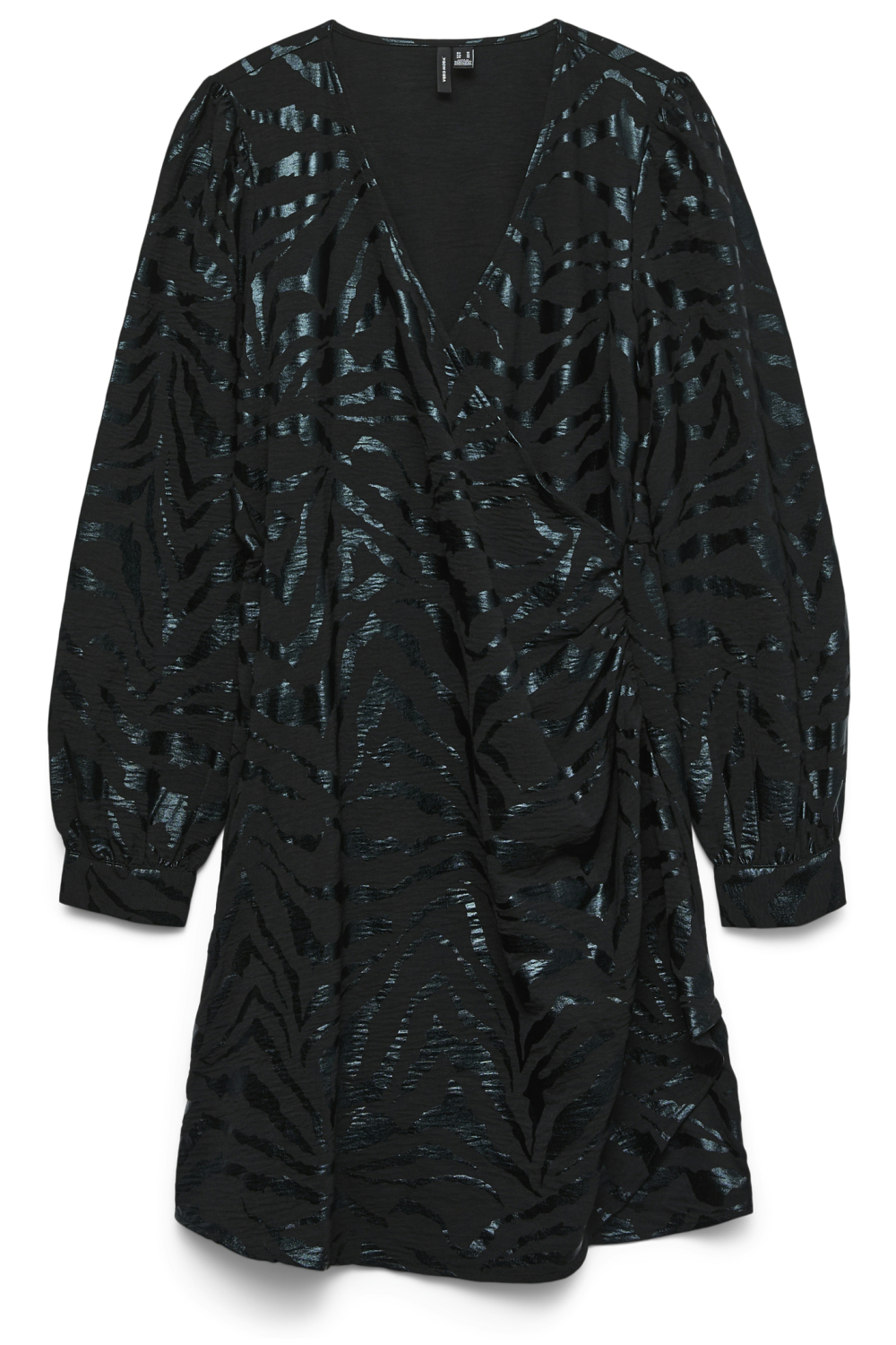 Deze elegante jurk van Vero Moda, gemaakt van 51% gerecycled polyester en 49% polyester, combineert duurzaamheid met stijl. De overslaghalslijn voegt een moderne touch toe, terwijl de glanzende print een subtiele flair biedt die perfect is voor winterse gelegenheden. De regular fit zorgt voor een comfortabele pasvorm, en de lange mouwen houden je lekker warm tijdens die koude avonden.