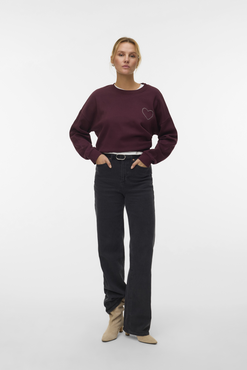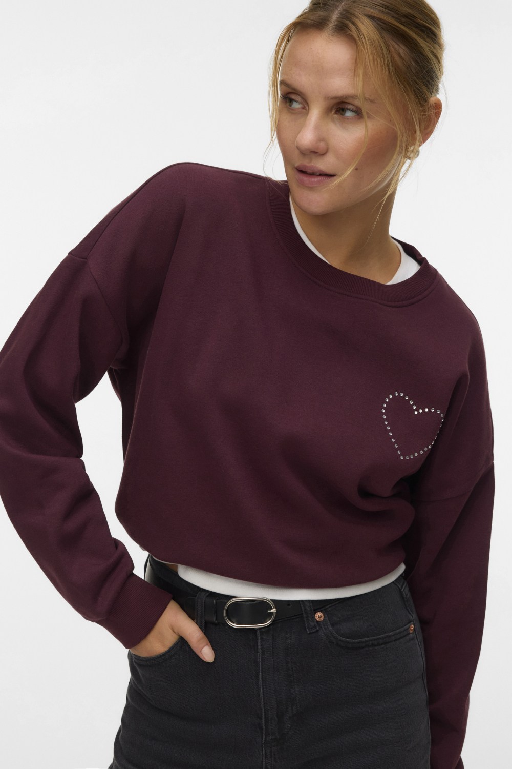 Deze casual Vero Moda sweater is een stijlvolle toevoeging aan jouw wintergarderobe. Gemaakt van een comfortabele mix van 52% katoen en 48% polyester, biedt deze trui een fijne balans tussen warmte en ademend vermogen. De sweater heeft een regular pasvorm en is ontworpen voor dames, waardoor hij aansluit bij verschillende lichaamsvormen zonder in te leveren op comfort. De warme bordeauxrode kleur en het speelse strasspatroon in de vorm van een hart op de borst geven deze trui een charmante uitstraling.