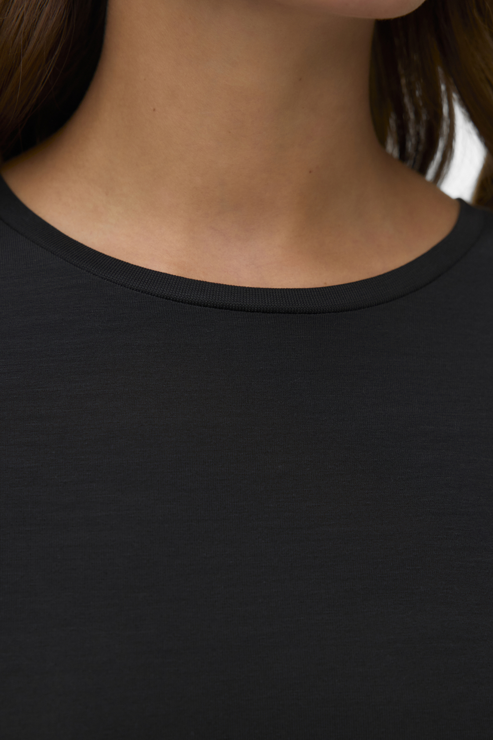 Dit elegante zwarte T-shirt voor dames van Vero Moda is een veelzijdige aanvulling op je zomergarderobe. Vervaardigd uit 95% lyocell en 5% elastaan, het biedt een comfortabele pasvorm dankzij de stretch en voelt zacht aan op de huid. De slim fit zorgt voor een gestroomlijnde look, terwijl de ronde hals en de lange mouwen een tijdloze uitstraling geven. Dit T-shirt is perfect voor allerlei gelegenheden, van een ontspannen dag thuis tot een casual uitstapje.