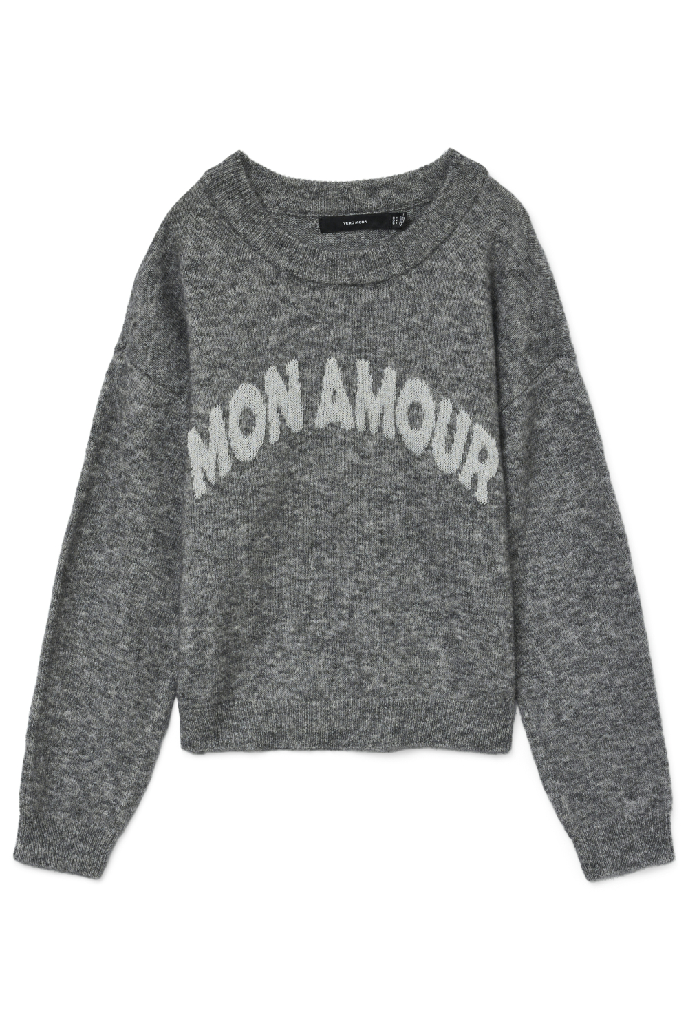 De Vero Moda damestrui is een stijlvolle toevoeging aan je herfstgarderobe. Deze regular fit trui heeft een klassieke ronde hals en is uitgevoerd in een zilverkleurige tint met speelse glitters voor een subtiele, sprankelende uitstraling. De tekst "Mon Amour" op de voorkant voegt een speelse touch toe die je look meteen opfrist. Deze knitwear trui is perfect voor casual dagen en geeft je outfit een trendy twist.