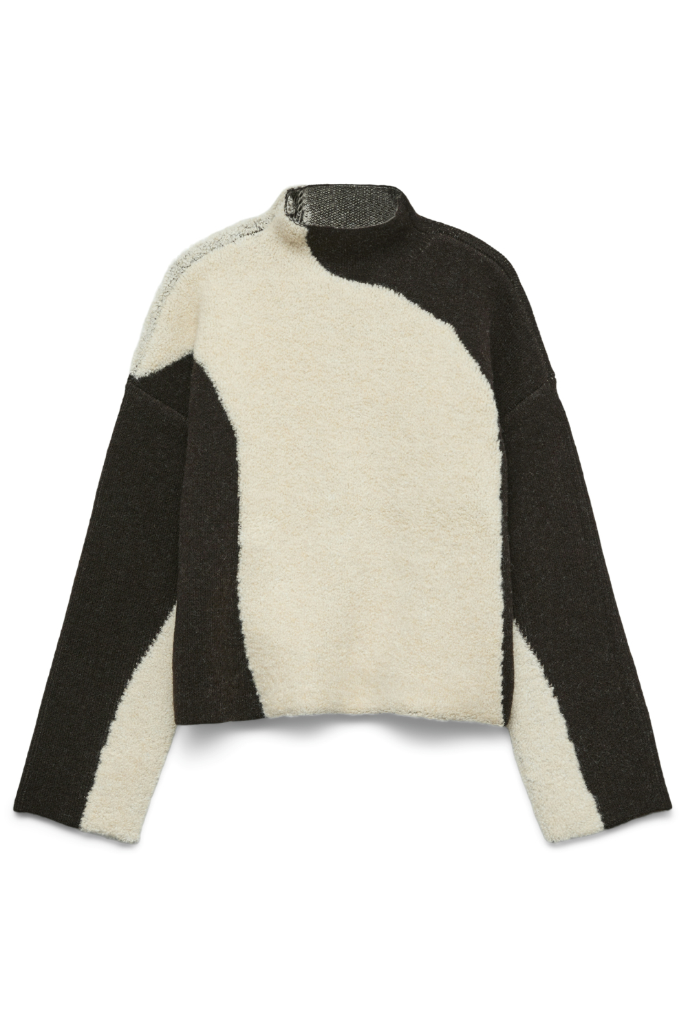 Deze Vero Moda damestrui brengt stijl en comfort samen in een opvallend design. De regular fit zorgt voor een ontspannen pasvorm, terwijl het high neck ontwerp je warm houdt tijdens koude winterdagen. Met een uniek kleurcontrast van zwart en crème is deze trui een echte blikvanger die een artistieke touch aan je look geeft. De structuur van de stof zorgt voor diepte en een luxueuze uitstraling, ideaal voor zowel casual als meer formele gelegenheden. Perfect voor dagelijks gebruik, biedt deze trui veelzijdigheid in je garderobe. Of je nu een dagje uit plant in de stad, een gezellige avond met vrienden hebt of gewoon comfortabel thuis wil blijven, deze trui is een uitstekende keuze. De lange mouwen en normale lengte maken hem makkelijk te combineren met een jeans of rok. Het gebruik van duurzame materialen maakt dit kledingstuk niet alleen stijlvol, maar ook een bewuste keuze voor de milieubewuste modebewuste vrouw.