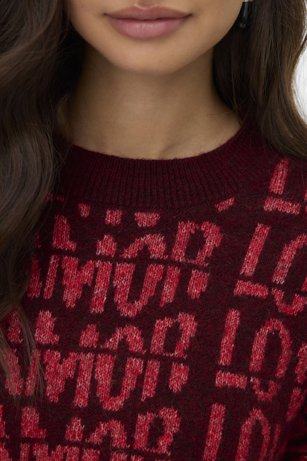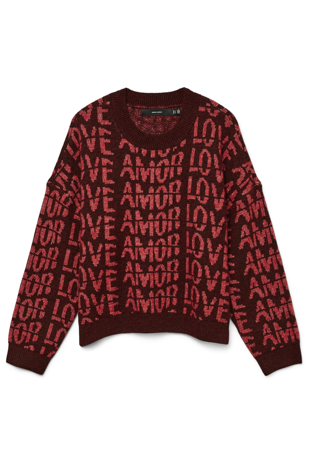 De Vero Moda trui is een stijlvolle toevoeging aan je wintergarderobe. Met zijn regular pasvorm biedt deze trui een comfortabel en ontspannen gevoel. De diepe bordeauxrode kleur gecombineerd met het opvallende "LOVE" en "AMOR" patroon geeft een moderne twist aan jouw dagelijkse look. Gemaakt voor dames en ontworpen met een ronde hals, geeft deze trui een speels karakter aan je outfit. De lange mouwen en normale lengte maken het een perfecte keuze voor de koudere maanden.