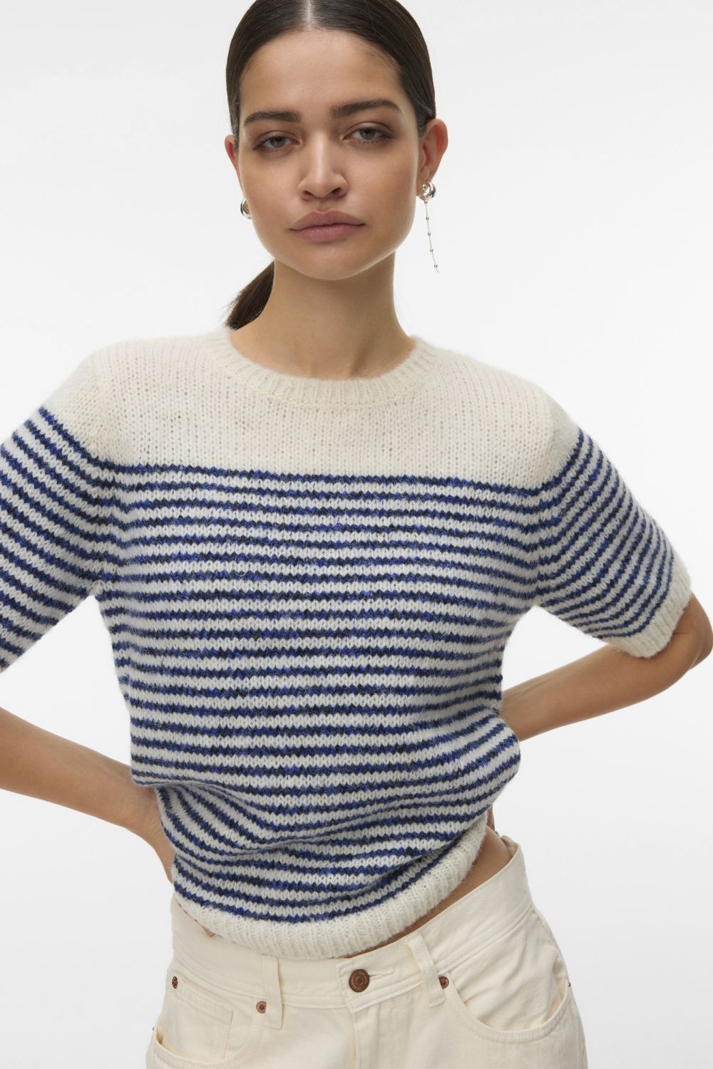 Deze Vero Moda trui met streepjespatroon is een frisse aanwinst voor je lente garderobe. Het ontwerp met korte mouwen en een ronde hals maakt deze trui geschikt voor zowel casual als meer verfijnde gelegenheden. Met zijn regular fit en normale lengte draag je deze trui comfortabel de hele dag door. Of je nu kiest voor een dagje uit of een ontspannen middag thuis, deze trui biedt de juiste balans tussen stijl en comfort. Dankzij het tijdloze ontwerp en de subtiele kleurencombinatie van blauwtinten op een crème achtergrond, kun je de Vero Moda trui gemakkelijk combineren met zowel lichte als donkere jeans of een nette broek. Het knitwear materiaal zorgt voor een aangename warmte in de frisse lentelucht, terwijl het duurzame aspect van de trui je een goede keuze biedt voor milieubewuste mode. Voeg dit veelzijdige kledingstuk toe aan je dagelijkse collectie voor een effortless stijl bij elke gelegenheid.