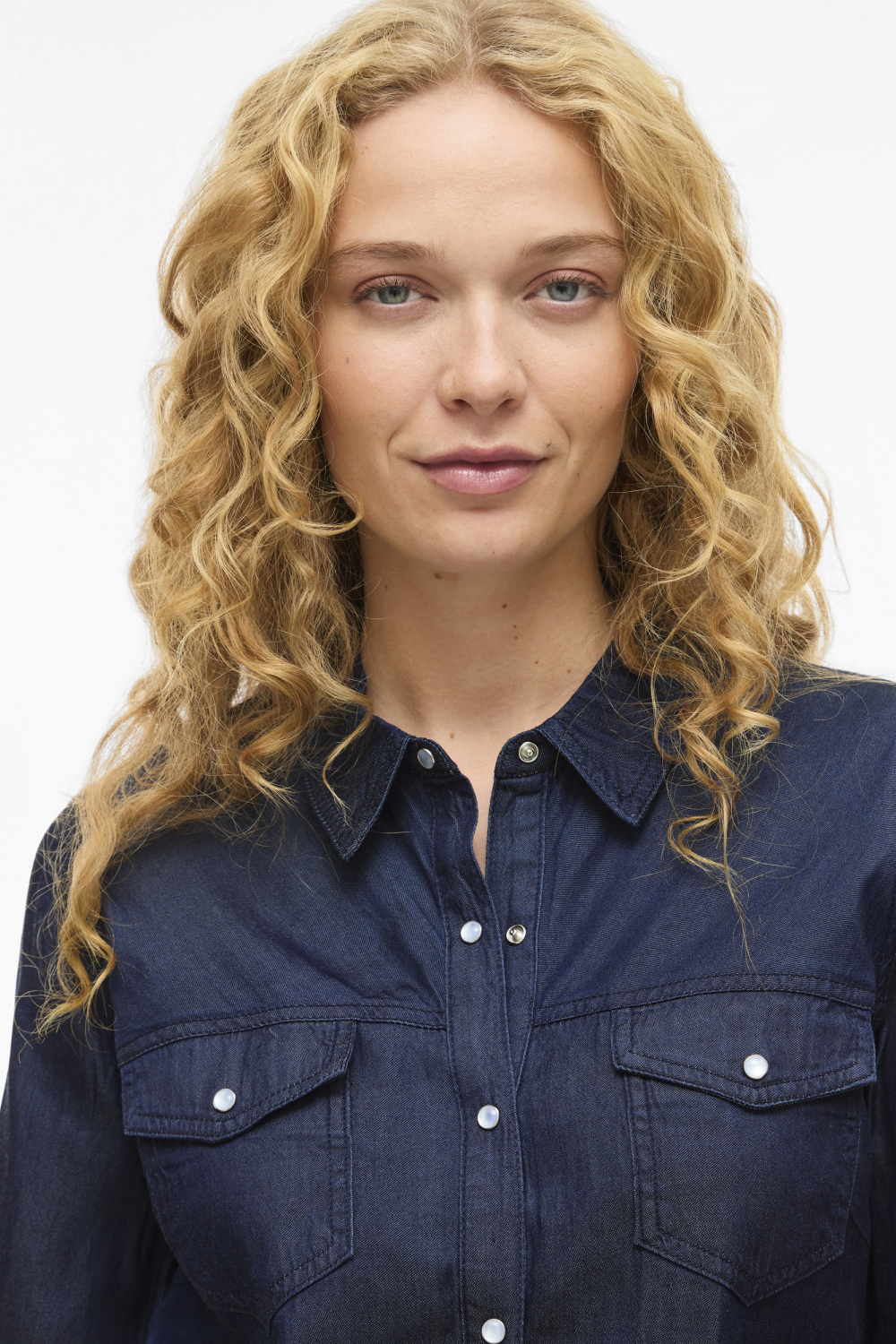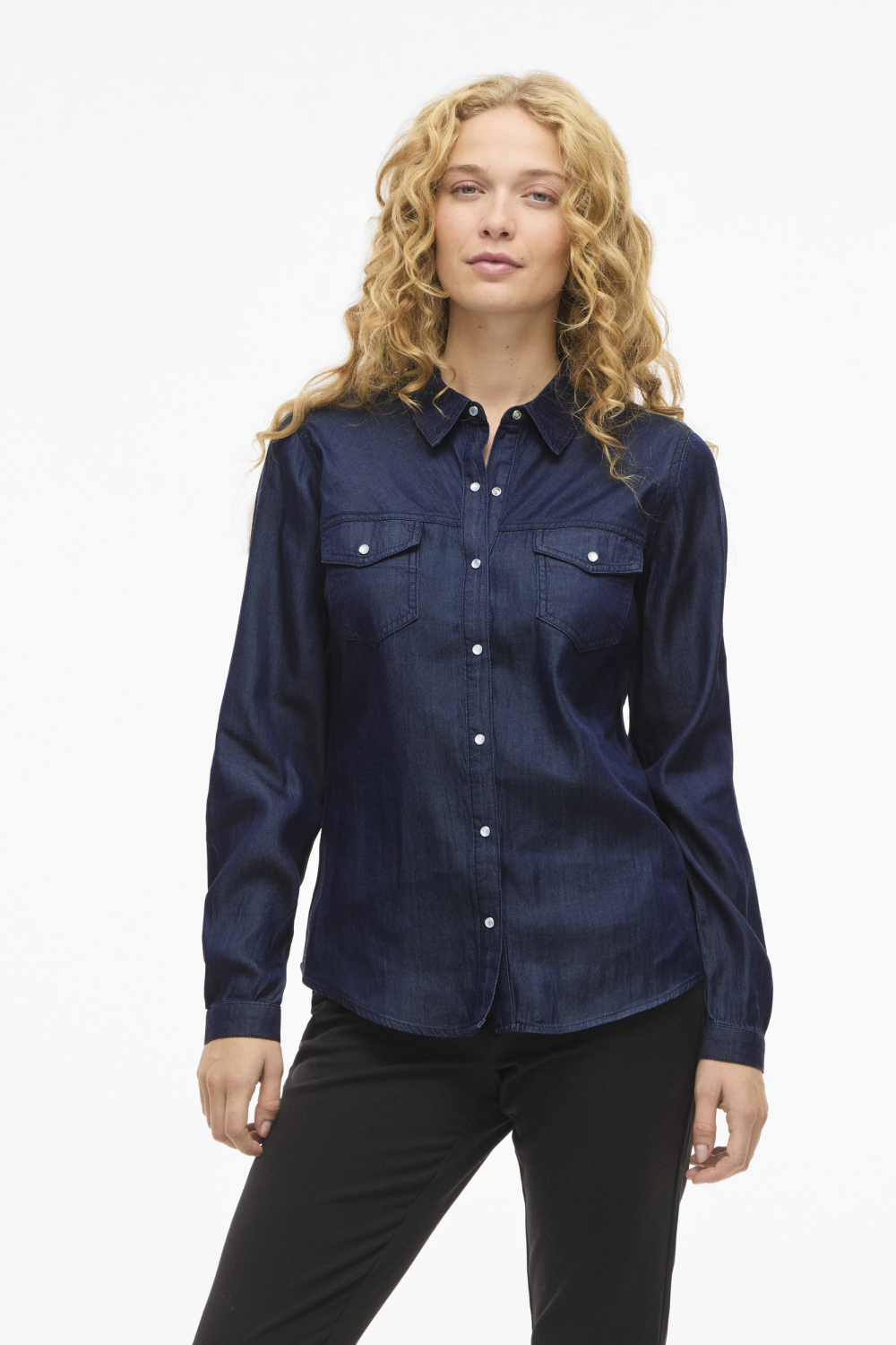 Deze dark blue denim blouse van Vila is een fraaie toevoeging aan je wintergarderobe. De blouse heeft een regular fit, wat zorgt voor een comfortabele pasvorm. De klassieke puntkraag en drukknoopsluiting geven een eigentijdse uitstraling. Met de double borstzakken voeg je een functioneel detail toe, terwijl de rinsewash wassing het denim een luxe afwerking geeft. Deze lange mouwen blouse is een veelzijdig item dat eenvoudig te combineren is. Dankzij de tijdloze stijl van deze Vila blouse kun je er zowel casual als netjes uitzien. Draag het met een jeans voor een relaxte uitstraling of combineer het met een rok voor een meer geklede look. Perfect voor zowel een dag op kantoor als een ontspannen avond, biedt deze blouse niet alleen stijl maar ook draaggemak. Ontdek de duurzame kwaliteiten en subtiele elegantie van deze must-have voor elk seizoen.