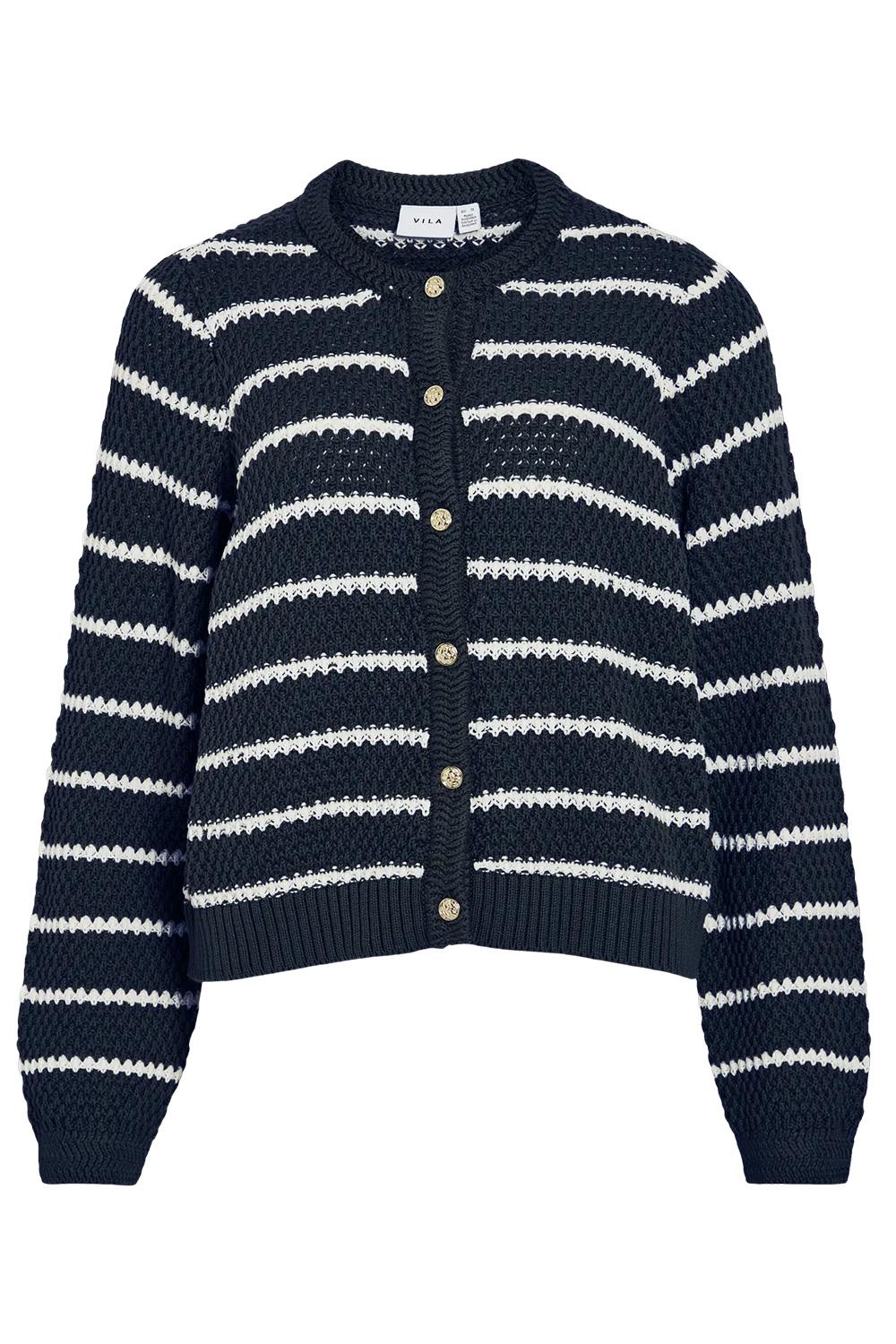 Deze elegante navy blazer en cloud dancer gestreepte vest van Vila is een stijlvolle aanvulling voor je lente garderobe. Gemaakt van 100% organisch katoen, biedt het een zachte en comfortabele pasvorm die ideaal is voor frisse lentedagen. Het vest heeft een knoopsluiting en een ronde hals, wat zorgt voor een klassieke uitstraling. Met de stijlvolle structuur en de opvallende gouden knopen geef je elke outfit een verfijnde touch. Dit Vila vest is perfect te combineren met zowel casual als meer geklede outfits. Draag het bijvoorbeeld over een eenvoudig T-shirt met jeans voor een relaxte daglook, of combineer het met een nette blouse en pantalon voor een iets formelere gelegenheid. De lange mouwen en de normale lengte maken het tot een veelzijdig kledingstuk dat comfort biedt zonder in te boeten op stijl. Of je nu naar een brunch gaat met vrienden of een dagje op kantoor doorbrengt, dit vest is een passende keuze.