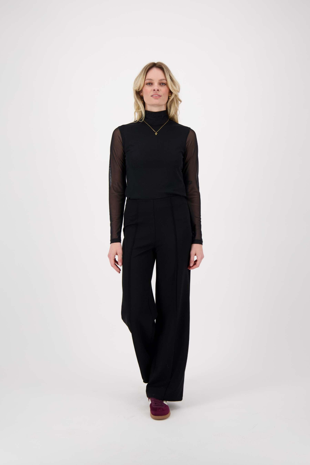 Dit zwarte T-shirt van het merk Zusss is een ideale toevoeging aan je wintergarderobe. Met een regular fit en een trendy colkraag straalt dit T-shirt een casual stijl uit. De lange mouwen zijn gemaakt van doorschijnend materiaal, wat een speelse en elegante look geeft. Het T-shirt bestaat uit 96% polyester en 4% elastan, wat zorgt voor een comfortabele pasvorm die mooi aansluit.